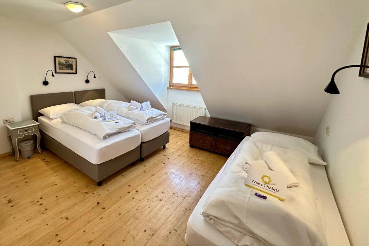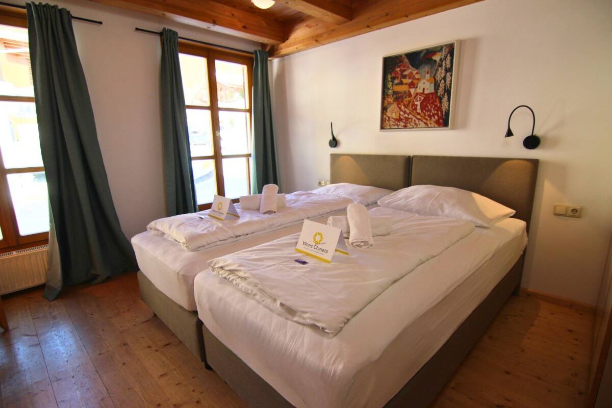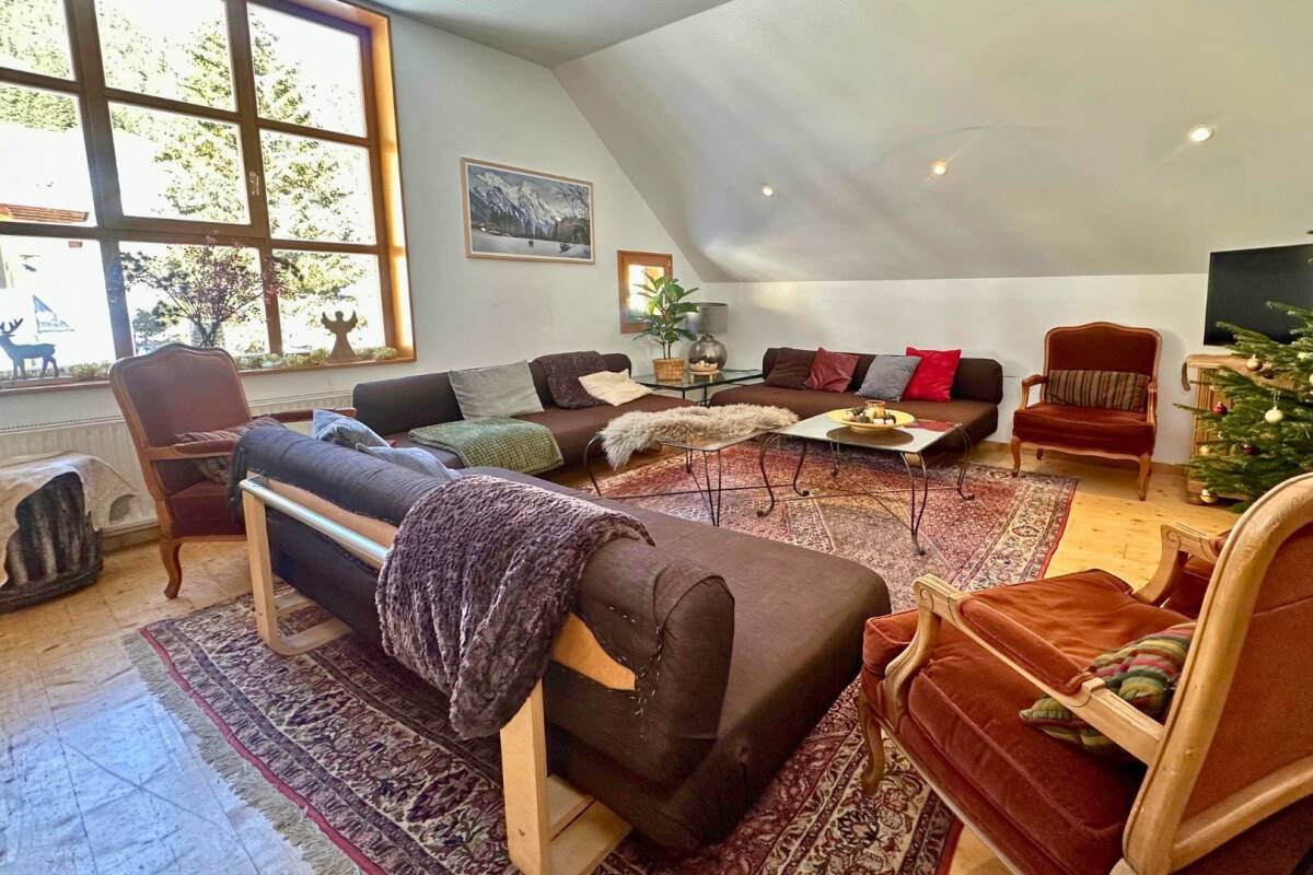 On the first floor, you’ll find six double bedrooms, one of which has the option for an extra bed. The second floor offers four double bedrooms and one triple bedroom. Additionally, the spacious living room is located on this floor. Thanks to the large windows, this room is beautifully lit throughout the day and offers a breathtaking view of the surrounding mountains.